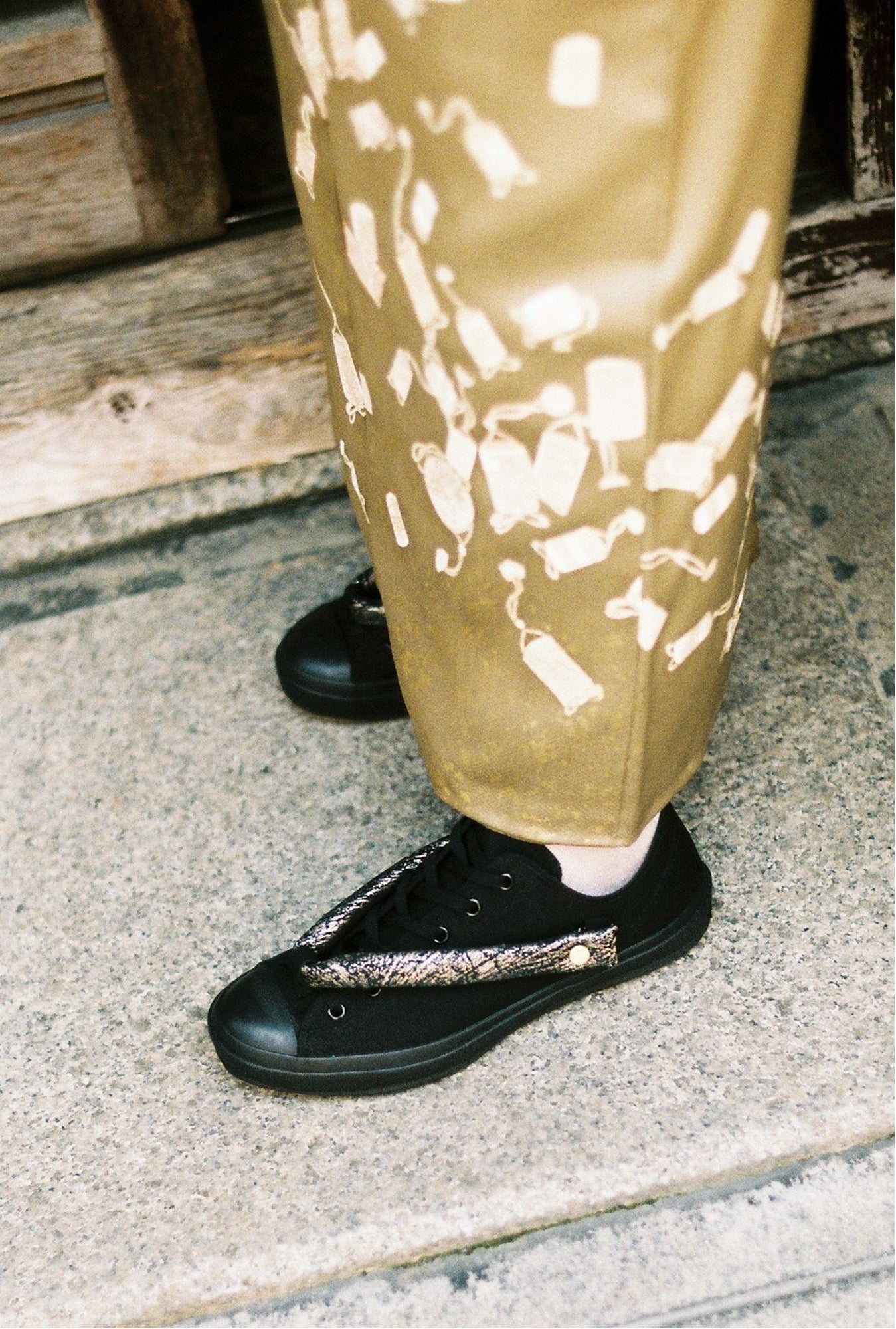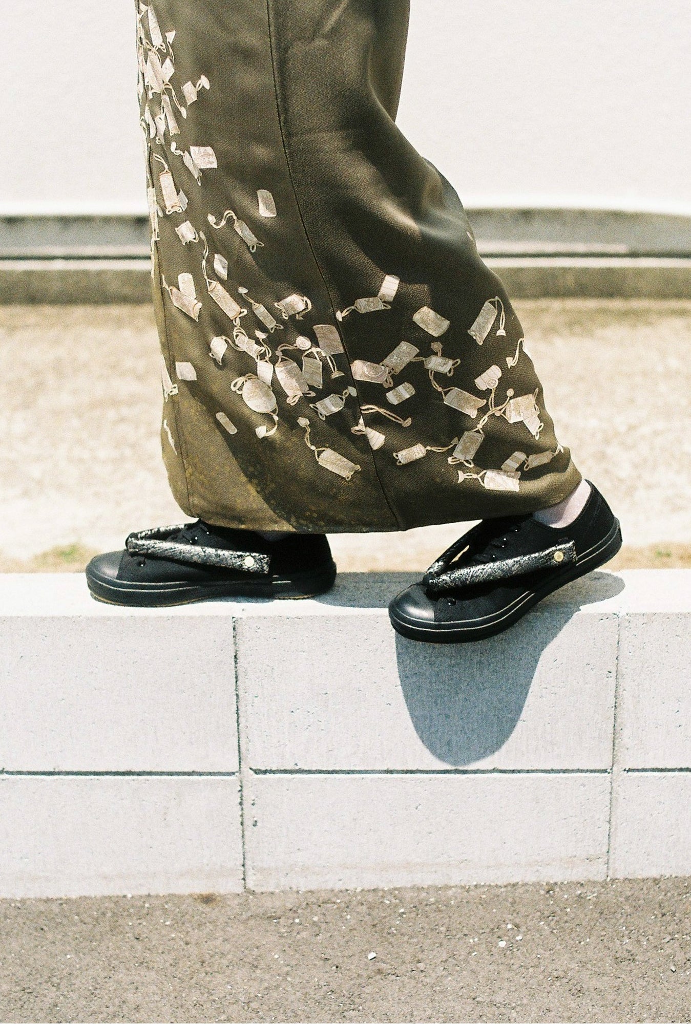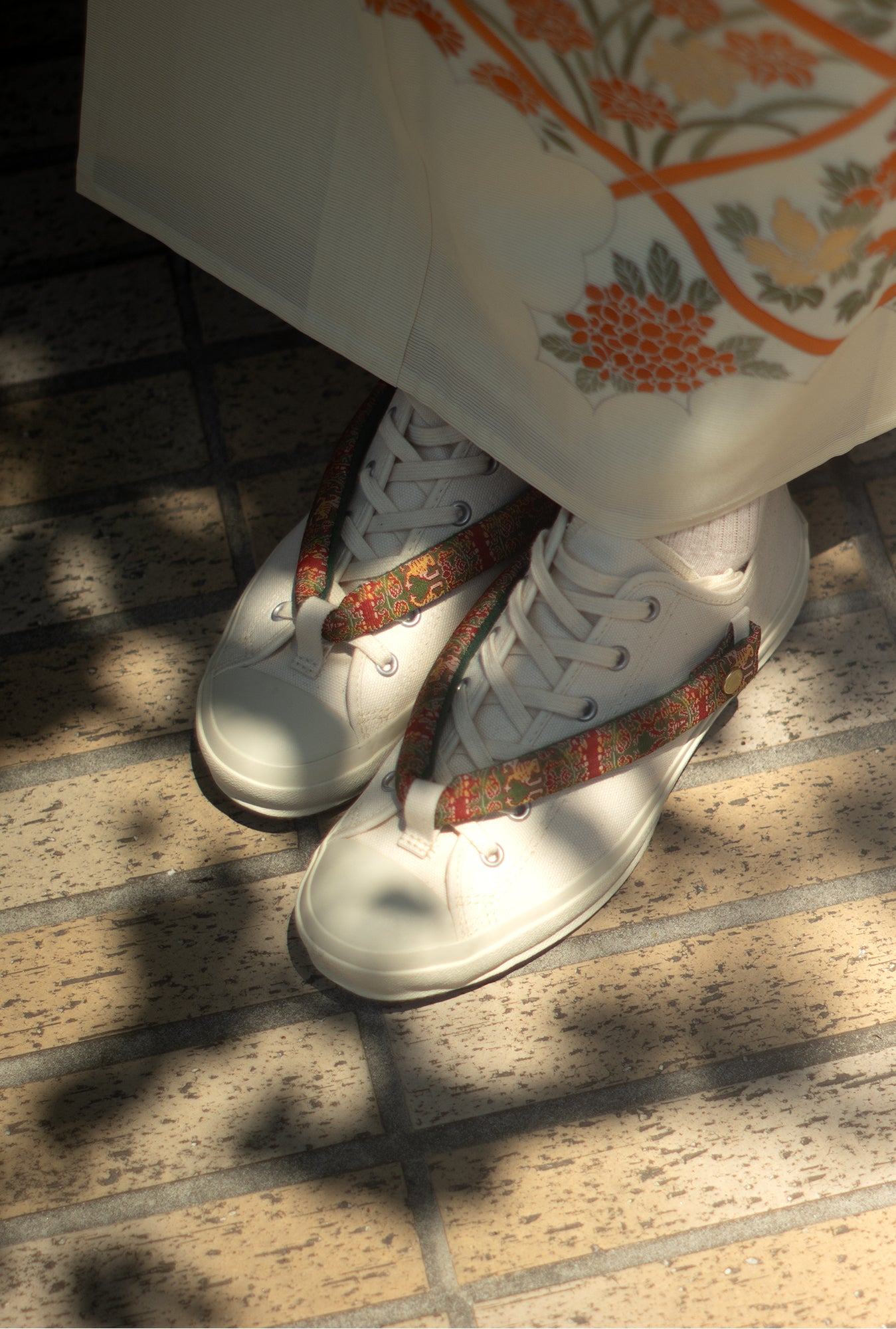 伝統的な草履/下駄の花緒と、現代のスニーカーとを融合させた一足。