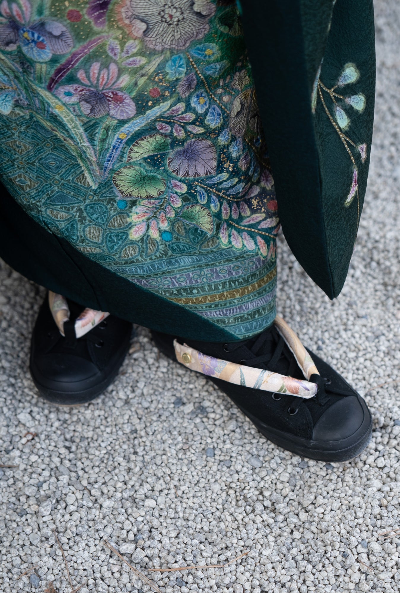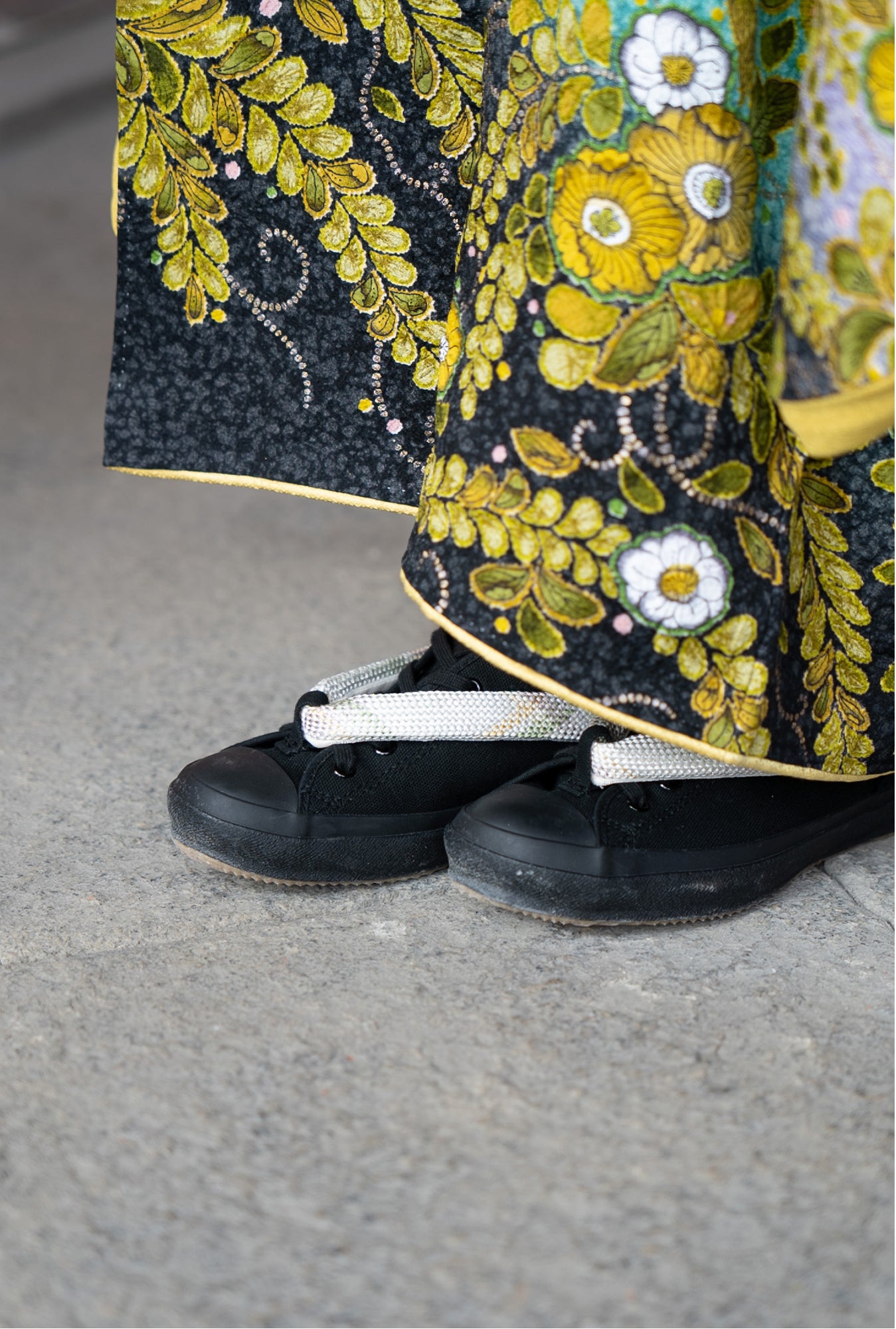 HANAOSHOESは、2017年の “都をどり” をきっかけに発足。そして2024年春、ニューバージョンとして、お客様自身で花緒をつけかえることができるようになりました。 つけかえる花緒や履き合わせる靴下を選ぶのが、きっと楽しくなってくるはず。ひとつひとつ、職人による手仕事です。 シューズ:MOONSTAR(1873年 創業 / 久留米)花緒仕立 職人:濱口商店(長浜)