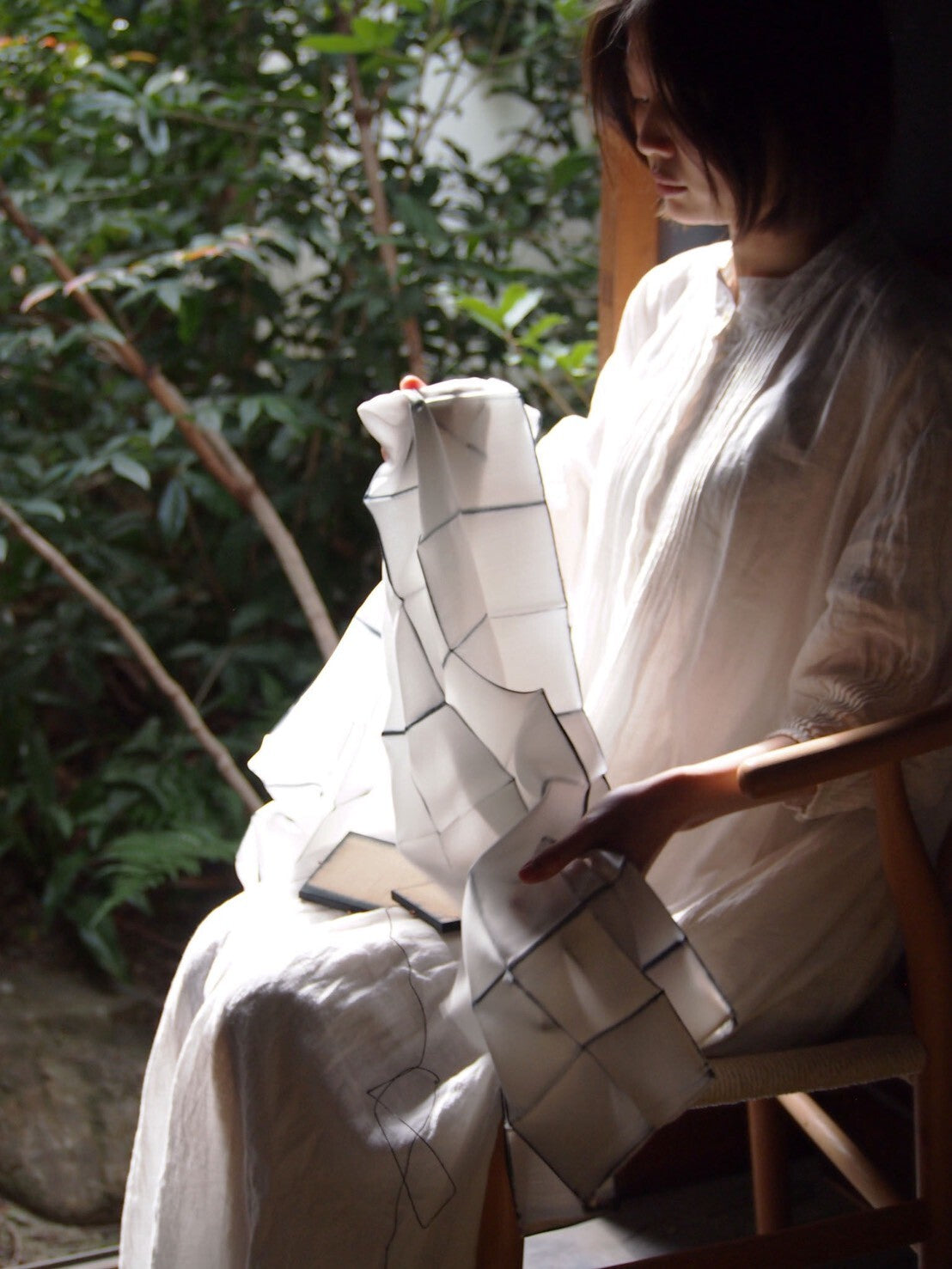 四角形の板(型板)の間に折りたたんだ布を挟み、染めることで模様を生み出す技法「板締め絞り」。