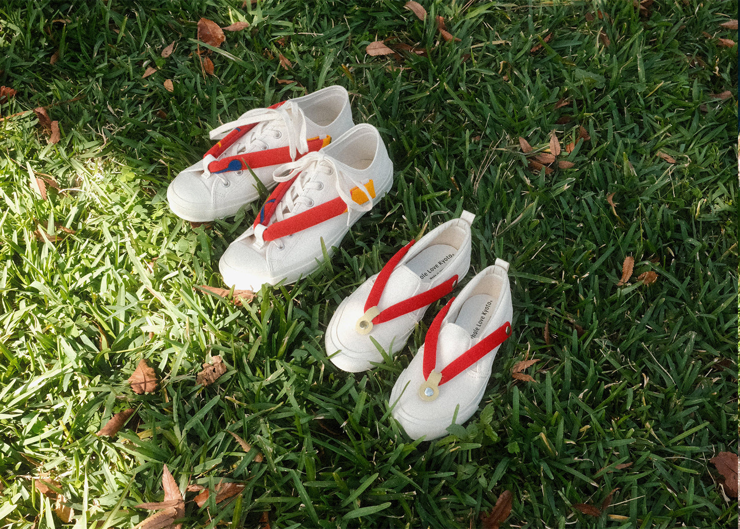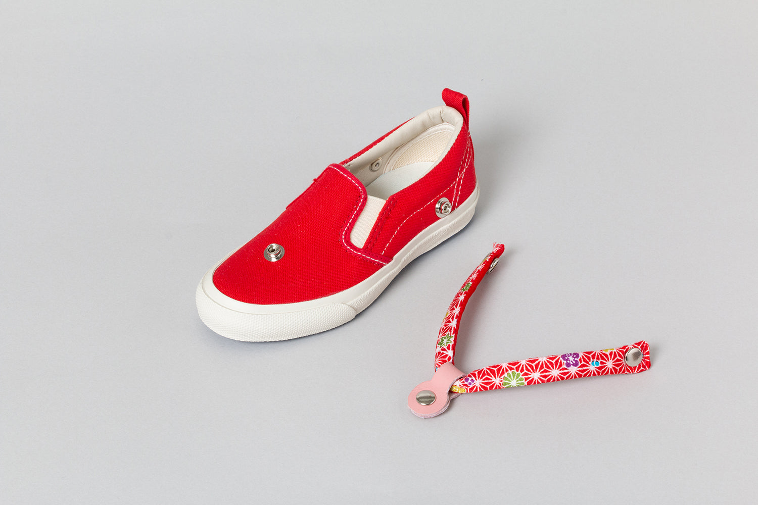 スニーカーは脱ぎ履きしやすいスリッポン仕様。久留米の老舗メーカー「MOONSTAR」の国内工場で丁寧につくられており、お子さまでも自分で履きやすく快適です。