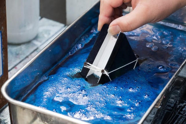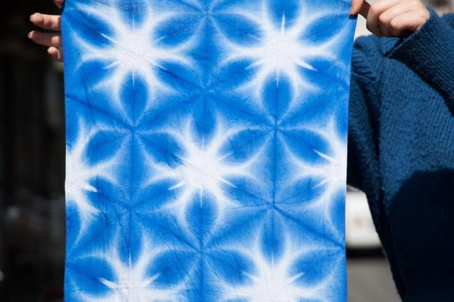 雪花絞りとは、三角の板(型板)の間に、折りたたんだ布を挟み、染めることで模様を作る技法のことです。三角の板のため、この技法からできる模様は、雪の結晶のように見えることから雪花と呼ばれています。