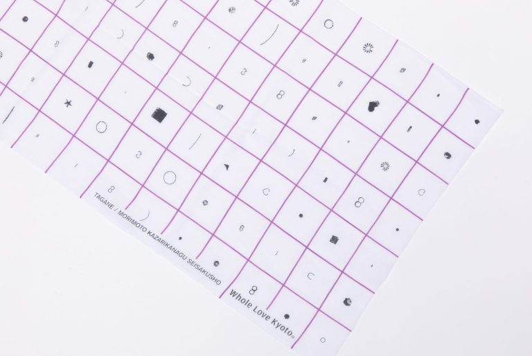 その鏨を「森本錺金具製作所」に実際にお借りし、拓本を取り、手ぬぐいのデザインに仕上げました。マスのなかにおさめた鏨の柄は全て柄が違います。その微妙な違いに、京都の手仕事の凄さがぎゅっと詰まっています。