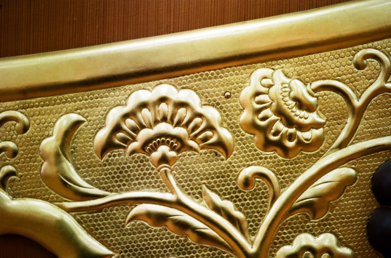 錺金具を施すために欠かせないのが「鏨」と呼ばれる道具です。職人は何千種類もある鏨の中から図柄に合うものを選び出し、金槌で一つ一つ打ち付けて模様を彫っていきます。