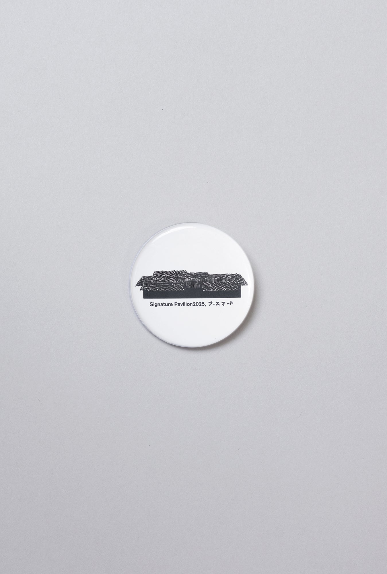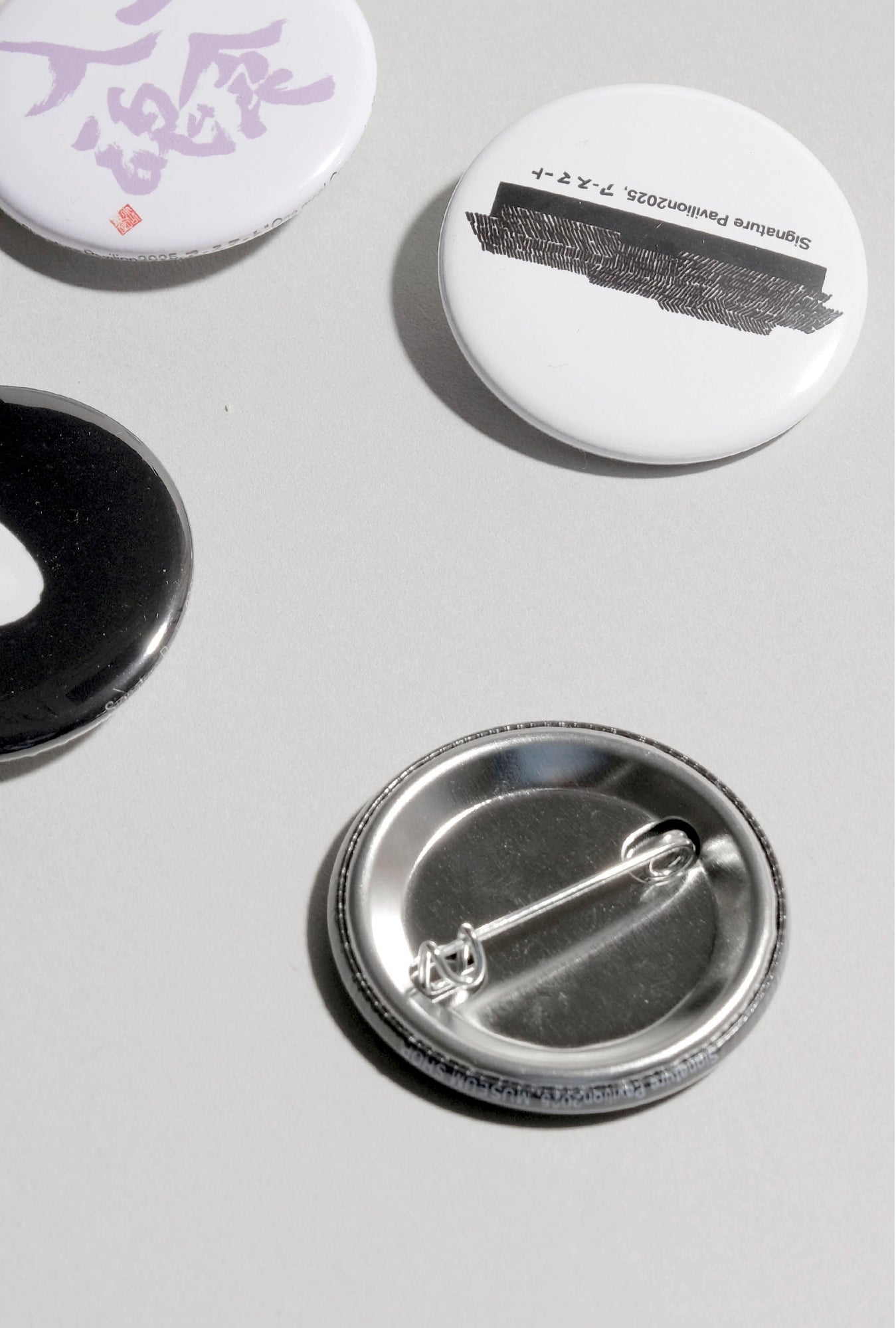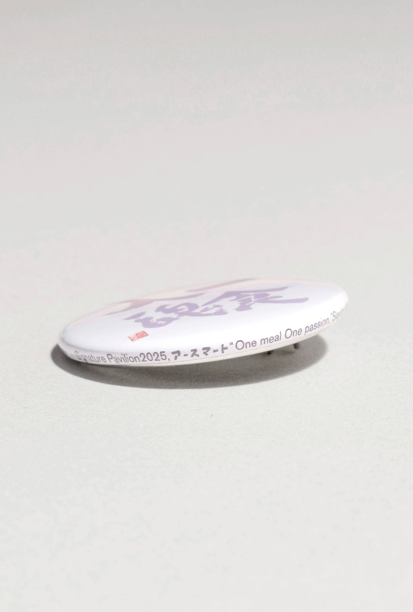 ロゴ、パビリオンシルエット、食に関する言葉でデザインしたフックピン缶バッジです。