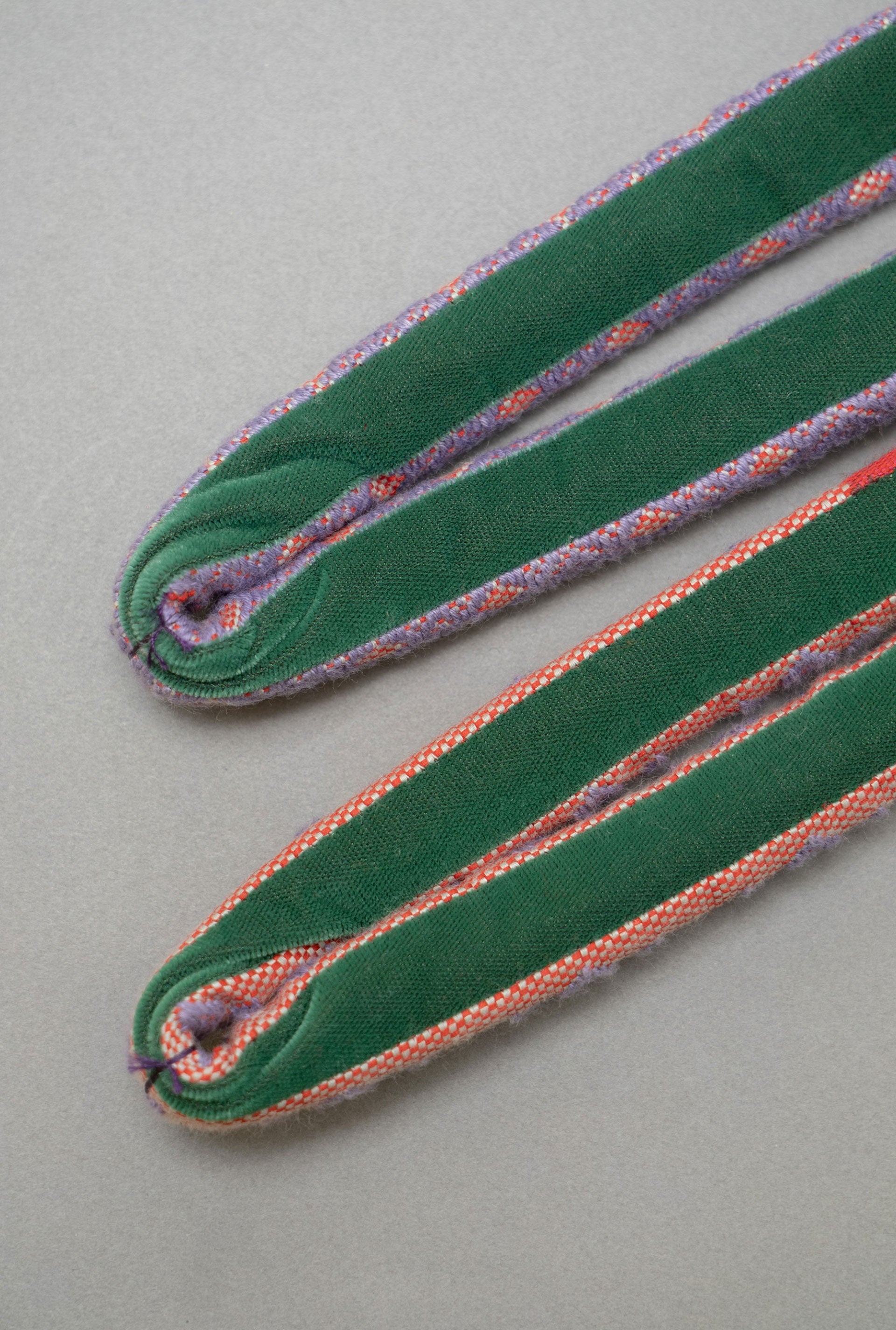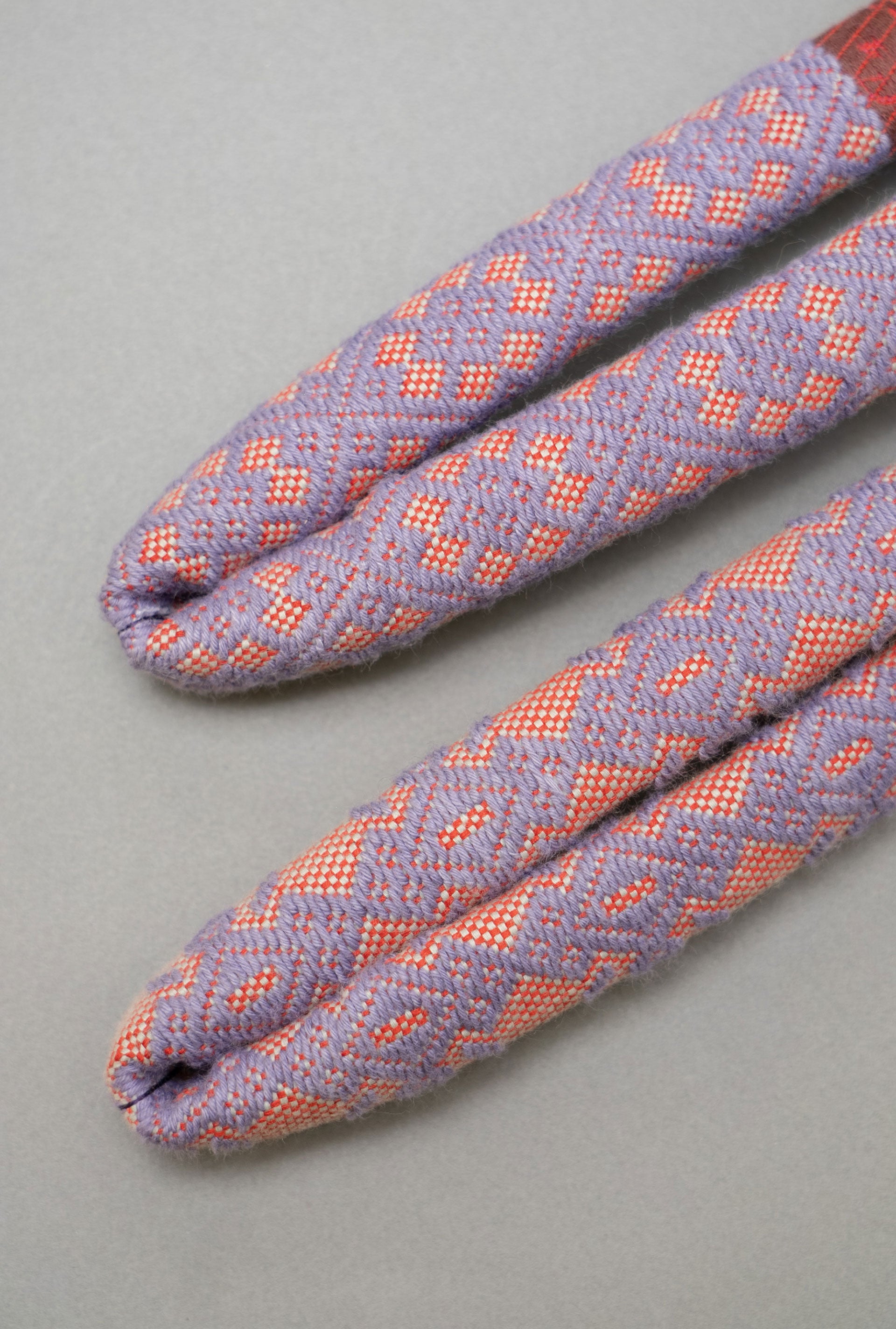 青森県の津軽地方を中心に伝わる刺し子の技法 “こぎん刺し”。 その技法を用いて生地にひと針ひと針、全て手縫いで模様を施し左右ばらばらのちぐはぐな花緒を制作している夏次郎商店。こぎん刺しの模様にはひとつひとつ意味があり、できあがる花緒はすべて一点物。左右の花緒の柄が違うため 入れ替えることもでき、自分だけのHANAO SHOESを楽しめます。