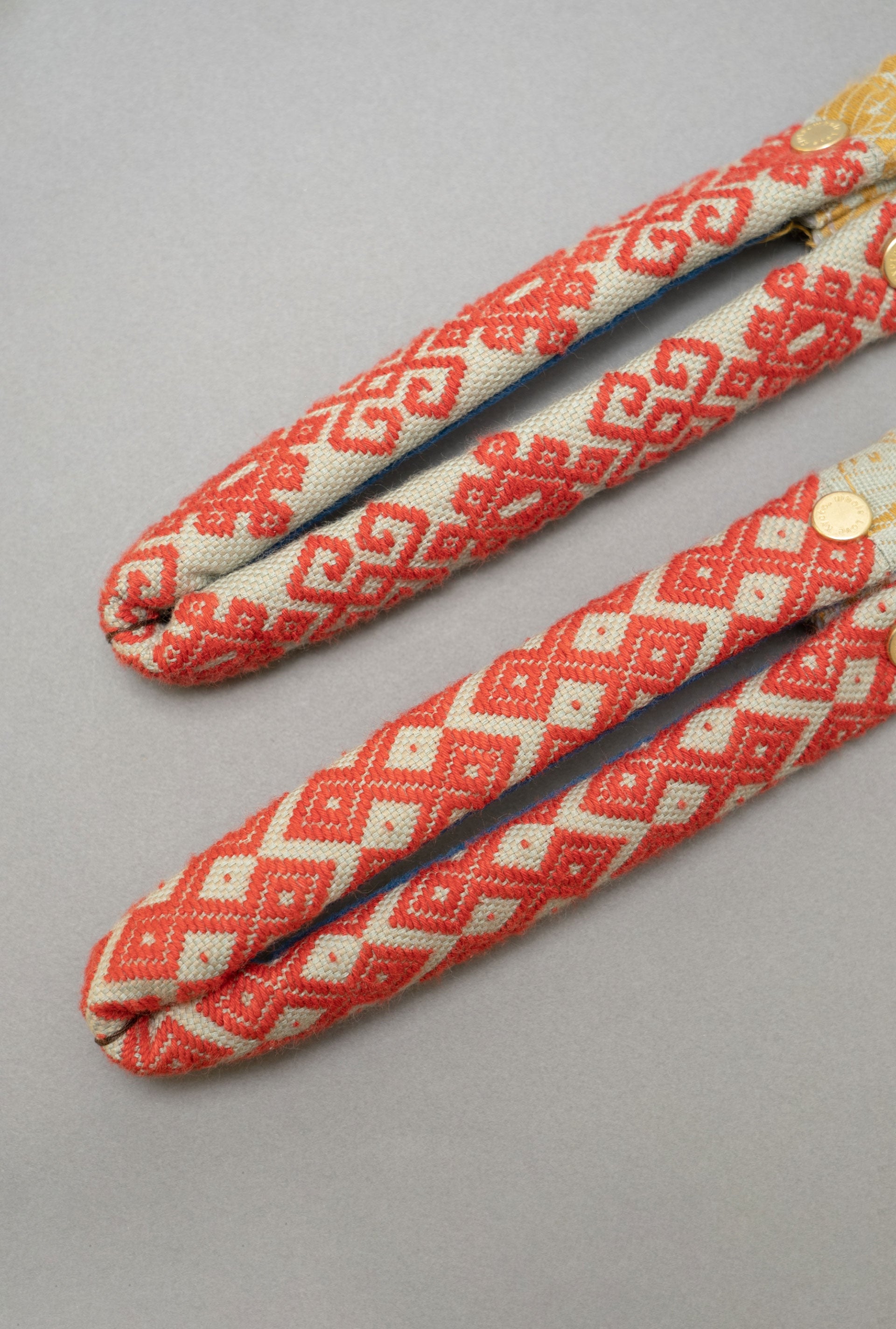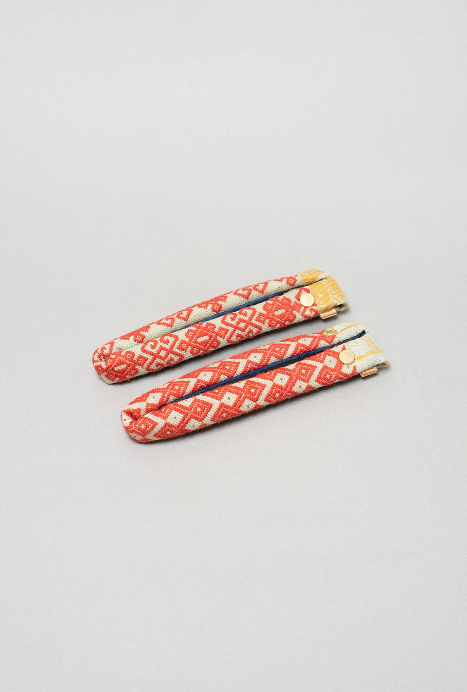 青森県の津軽地方を中心に伝わる刺し子の技法 “こぎん刺し”。 その技法を用いて生地にひと針ひと針、全て手縫いで模様を施し左右ばらばらのちぐはぐな花緒を制作している夏次郎商店。こぎん刺しの模様にはひとつひとつ意味があり、できあがる花緒はすべて一点物。左右の花緒の柄が違うため 入れ替えることもでき、自分だけのHANAO SHOESを楽しめます。