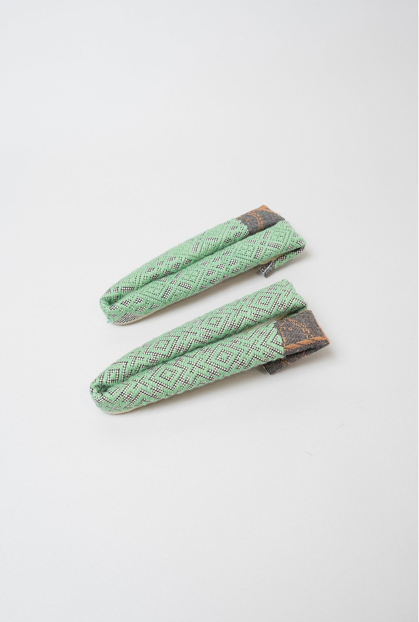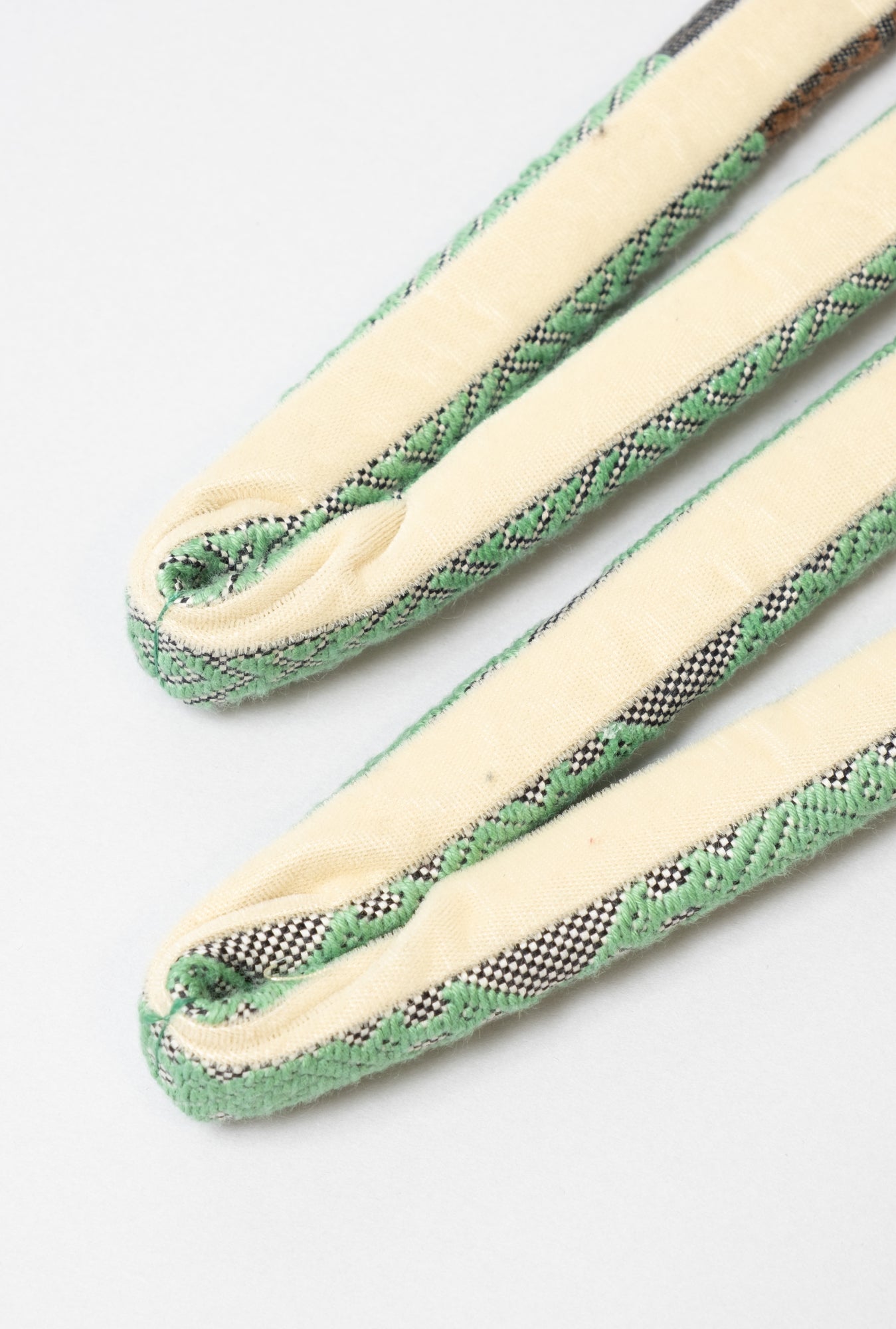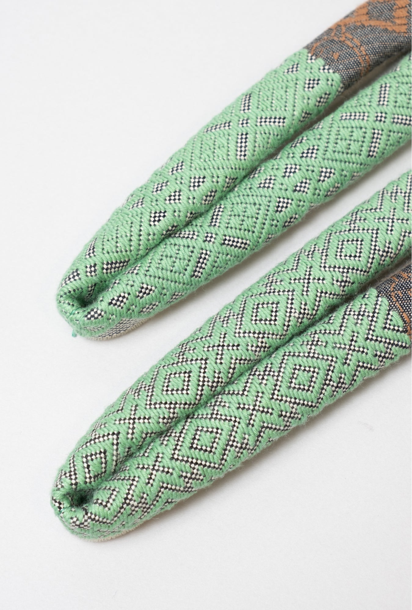 青森県の津軽地方を中心に伝わる刺し子の技法 “こぎん刺し”。 その技法を用いて生地にひと針ひと針、全て手縫いで模様を施し左右ばらばらのちぐはぐな花緒を制作している夏次郎商店。こぎん刺しの模様にはひとつひとつ意味があり、できあがる花緒はすべて一点物。左右の花緒の柄が違うため 入れ替えることもでき、自分だけのHANAO SHOESを楽しめます。