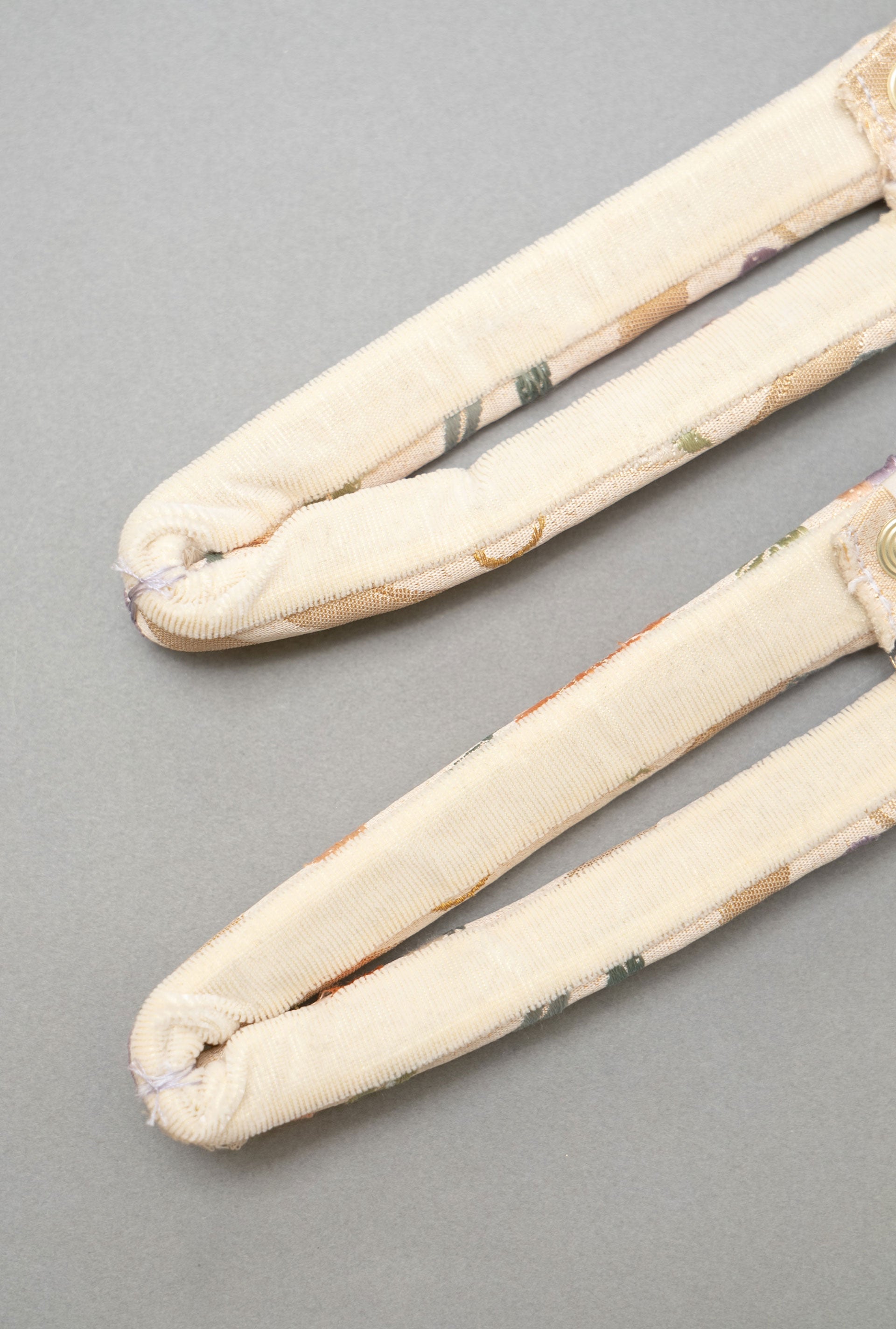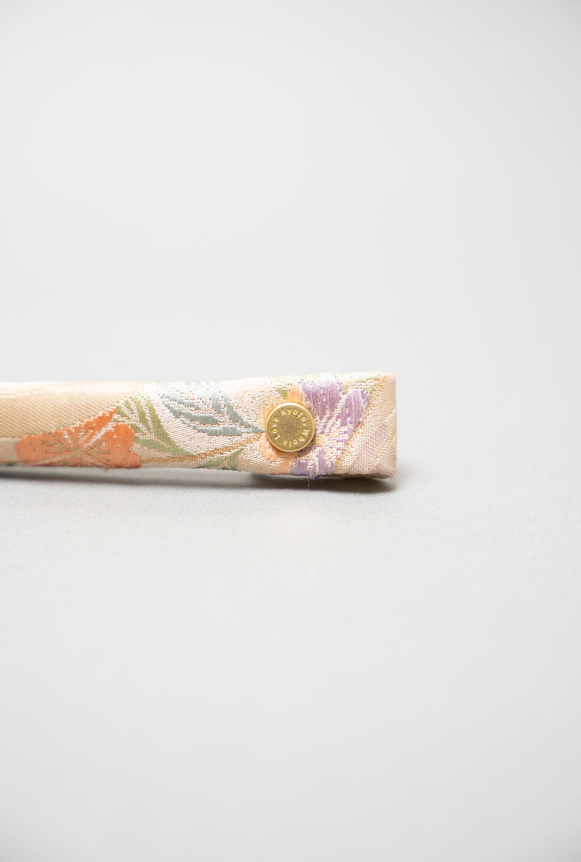 桜や梅、菊など様々な季節の草花が描かれた中に蝶もあり縁起の良い帯地から花緒に仕立てました。