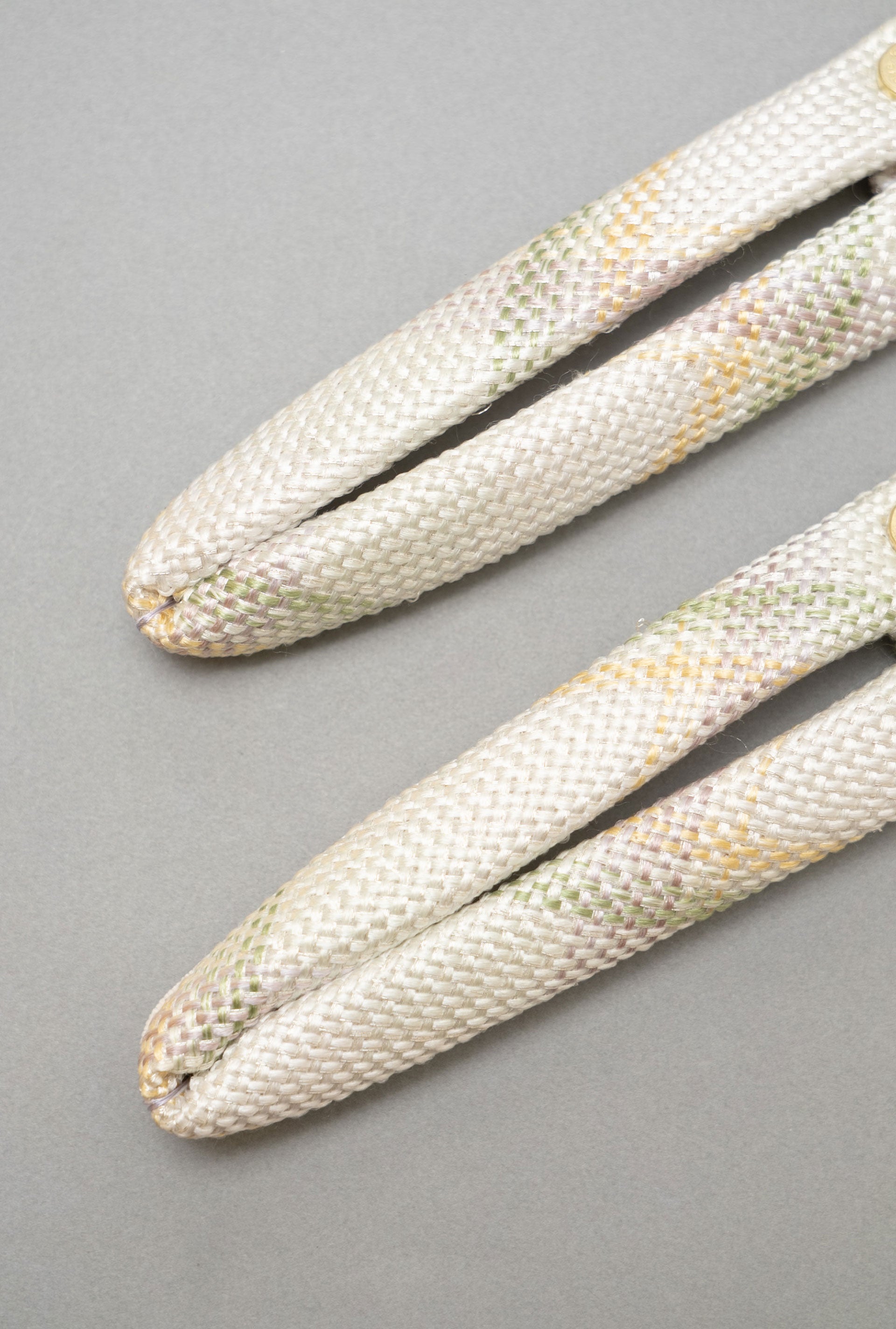 桜や梅、菊など様々な季節の草花が描かれた中に蝶もあり縁起の良い帯地から花緒に仕立てました。