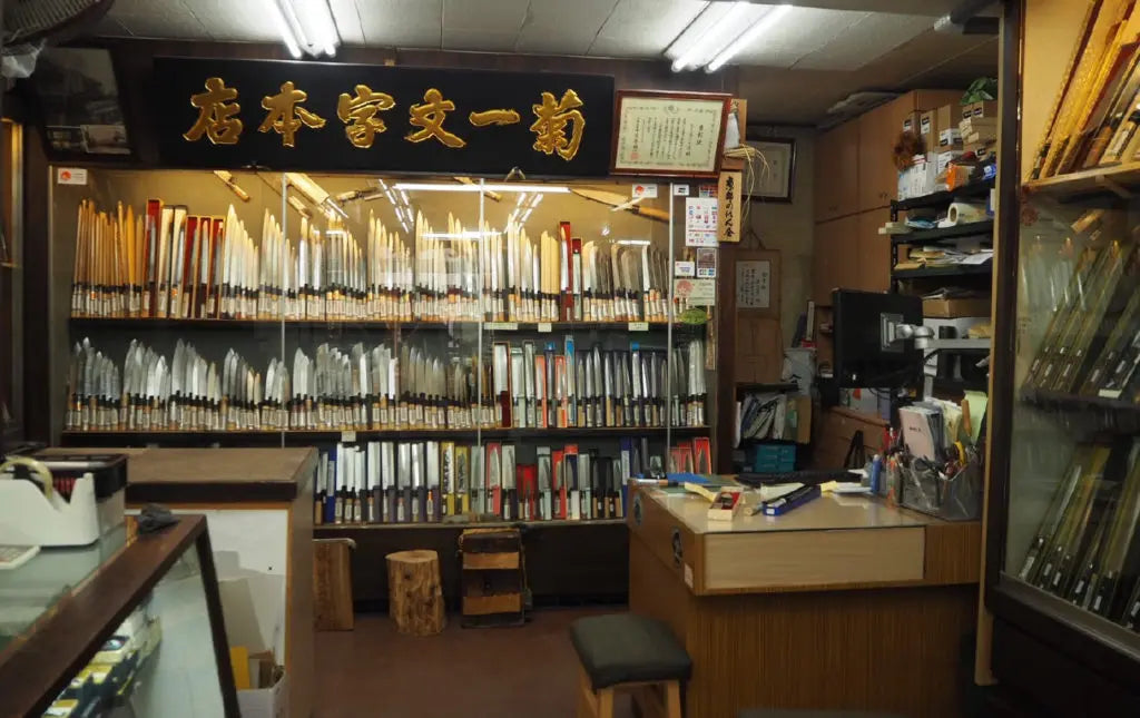 刃物専門店の「菊一文字」ならではの種類の豊富さと、沢山の刃物が並ぶ店内の雰囲気を感じることができる一枚です。